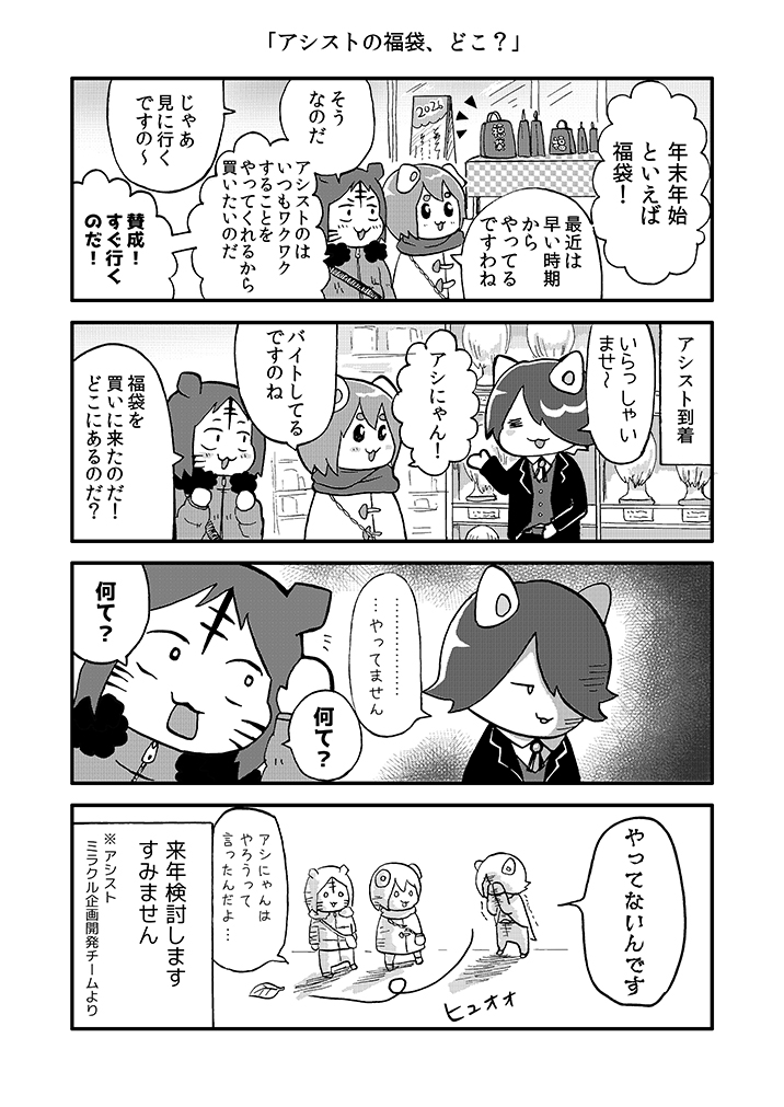 ★アシにゃん四コマ劇場★第310話 アシストの福袋、どこ?