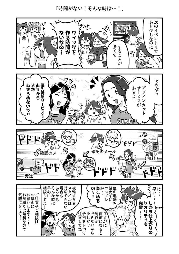 ★アシにゃん四コマ劇場★第313話 時間がない!そんな時は…! 2026年1月27日アシにゃん漫画アシストSTAFF 『デザインカットサービス』なら 忙しくても!ウィッグカット苦手でも! コスプレが楽しめる🎶 🔻『デザインカットサービス』はコチラ!