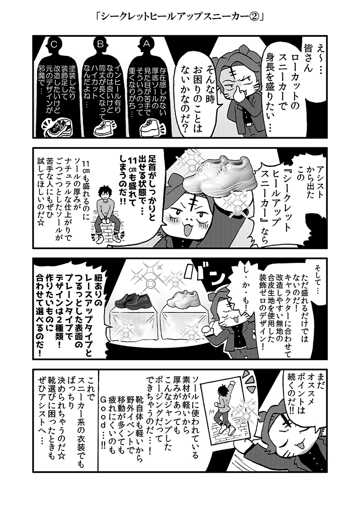 ★アシにゃん四コマ劇場★第317話 シークレットヒールアップスニーカー② 2026年2月17日アシにゃん漫画アシストSTAFF 🐯<11cm盛れるスニーカーは アシストにあるのだ…!! 🔻『シークレットヒールアップスニーカー』はコチラ!