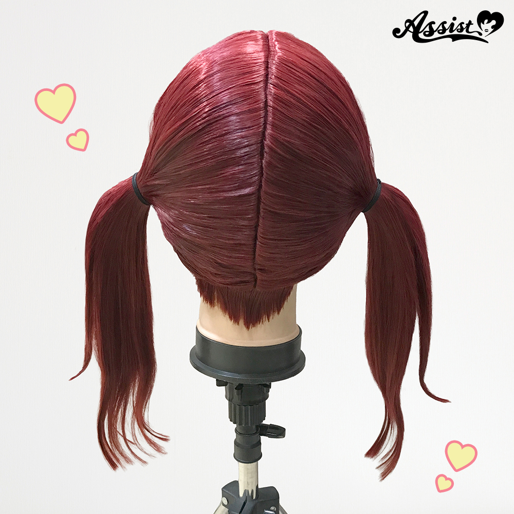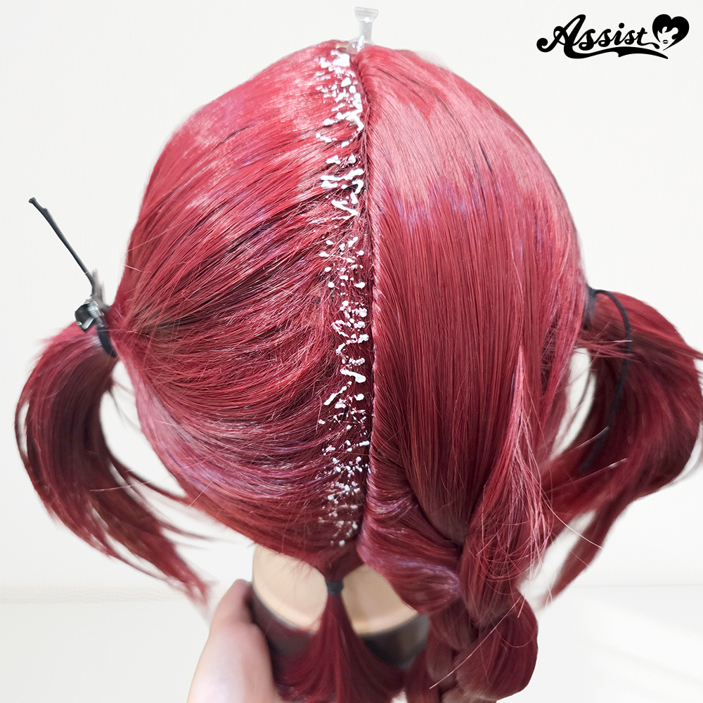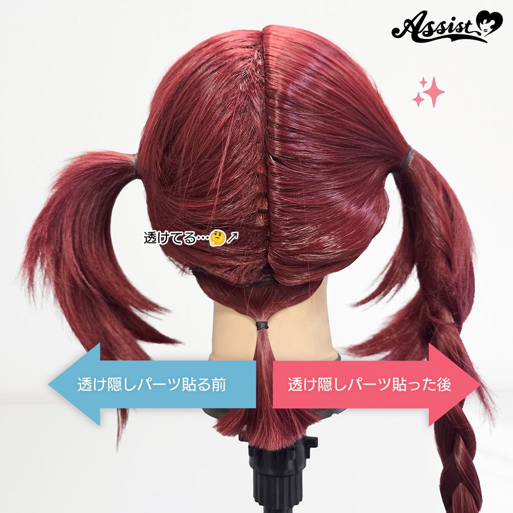 パーツを接着し乾燥させた後、『透け隠しパーツ』の毛束とベースウィッグのツインテール部分をまとめて結びます。