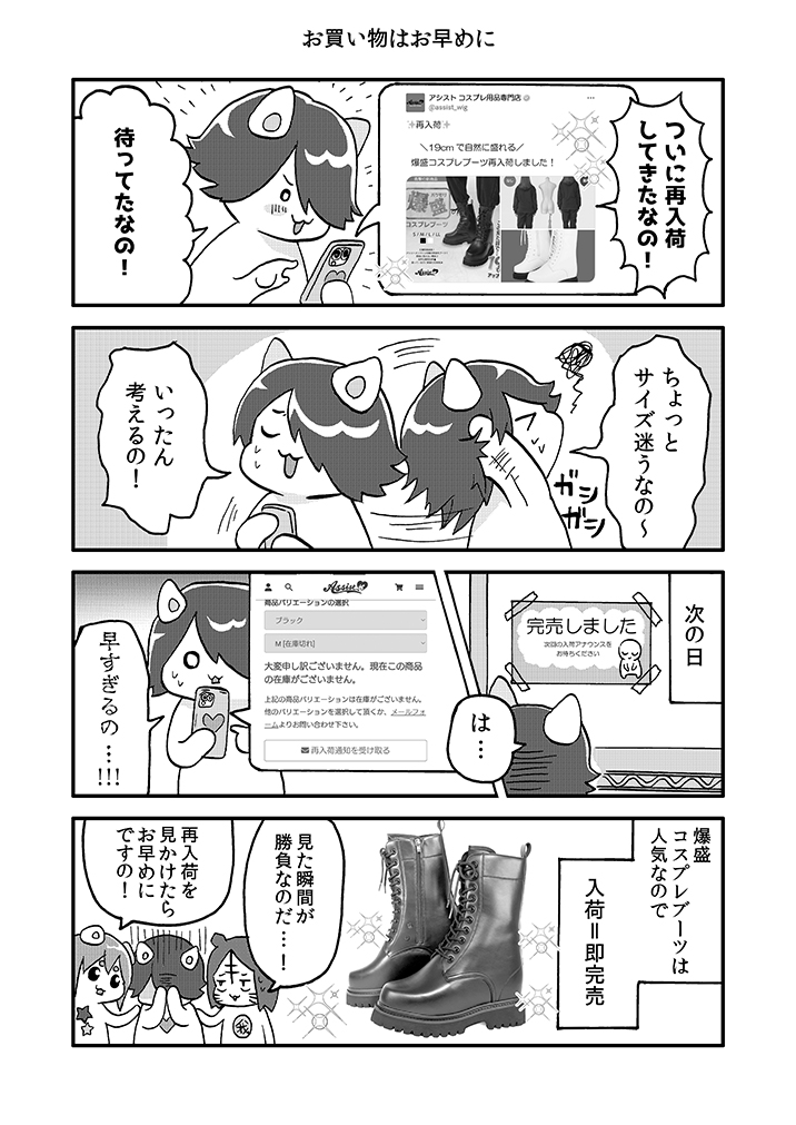 ★アシにゃん四コマ劇場★第325話 お買い物はお早めに 2026年4月21日Webスタッフブログ, アシにゃんブログアシストSTAFF 大人気商品はたくさんの方にお手に取っていただけるように在庫を確保しているのですが、予想以上に売れてしまう可能性もございます。 ご予定のある方は、ご購入はお早めにお願いいたします🙇♀️ 🔻『爆盛コスプレブーツ』はコチラ!